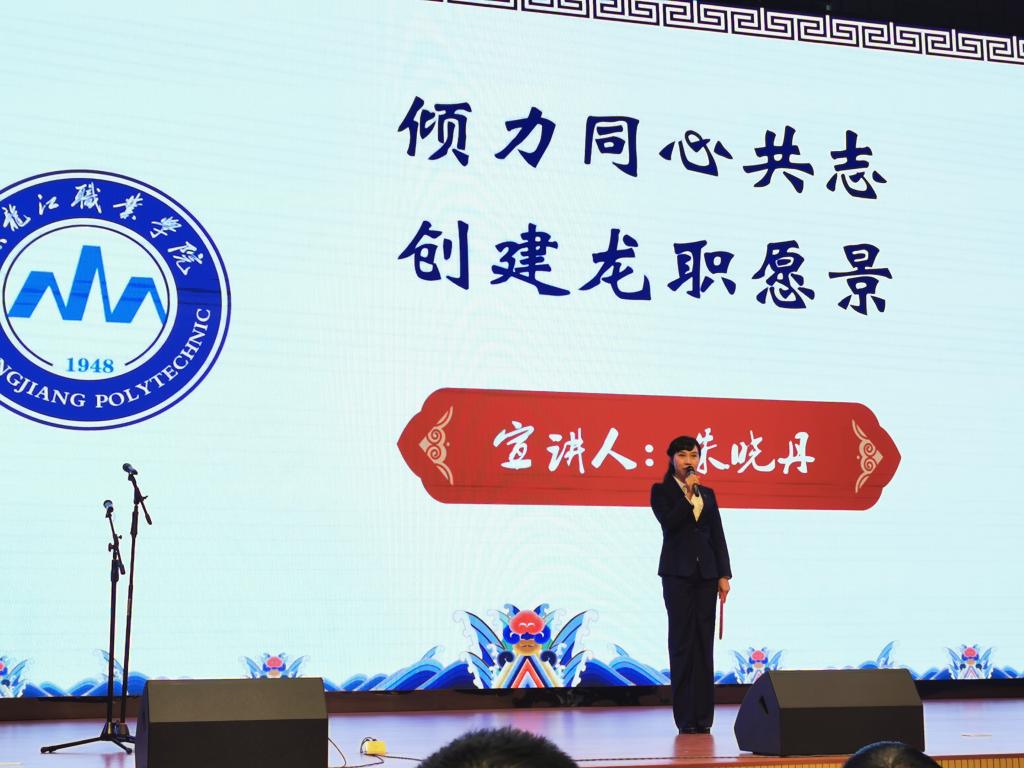 宣讲结束后,学校党委书记赵继会有感而发,即兴演讲。赵继会同大家一起回顾了学校建设国家骨干高职院校、申报创建国家“双高”院校的奋斗历程,一起重温了“龙职”人为实现龙职梦想而艰苦奋斗、励精图治的光辉岁月。赵继会指出,龙职梦想是建设“高职教育名校、继续教育强校”,龙职梦、中国梦同频共振,我们的使命是“当好民族复兴的铺路石”,这是我们的政治信仰和价值追求。龙职灵魂是“当好学生的铺路石”,铺路石品格是“踏实、承重、坚守、开拓”,“铺路石”精神内涵是“家国情怀、工匠品格、进取意识和卓越追求”,在学校各项重大工作中涌现出许许多多身体力行“铺路石”精神的先进人物,他们是“龙职”永远要褒扬的人。龙职品牌是学校优质办学质量并得到社会高度认同的金字招牌,长城内外、大江南北,我们有特色、有优势、有实力,这是我们有底气“山高人为峰”、敢为天下先的自信和担当。赵书记满怀激情的讲话让大家振奋昂扬,干劲倍增,更加坚定了向榜样学习看齐、为实现龙职梦和中国梦自觉奋斗的信念。大家一致认为,龙职梦想、龙职灵魂、龙职品牌,三位一体,顶层设计,守正创新,擎画了学校“十四五”时期的发展蓝图,决心在榜样力量感召下,众志成城,奋力夺取“龙职”全面发展的新胜利!