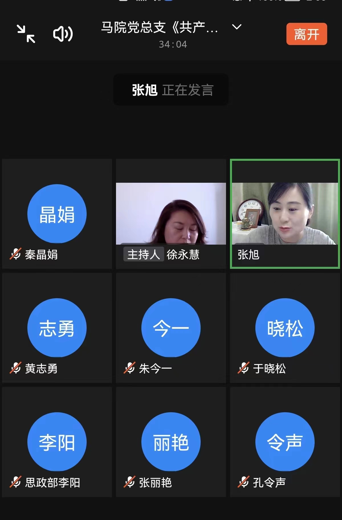 为迎接党的二十大胜利召开,在马克思主义学院党员中形成理论学习的新热潮,马克思主义学院党总支于2022年9月9日下午1点30分召开了集体理论学习会议,本次集体学习由第一支部负责主持和分享,第一党支部书记徐永慧主持,马克思主义学院党总支全体党员参加,采用钉钉会议线上进行,学习内容主要包括《共产党宣言》和《习近平谈治国理政》第四卷。